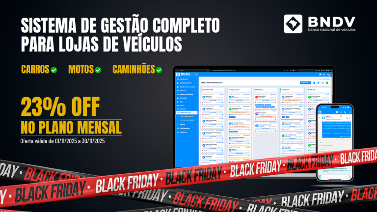 Se você busca organização e resultado para sua loja de veículos, aproveite a Black Friday do BNDV. Porque quem investe em gestão ganha tempo e vendas. Clique aqui e fale com nosso time comercial para ativar seu plano com desconto, ou então acesse bndv.com.br.